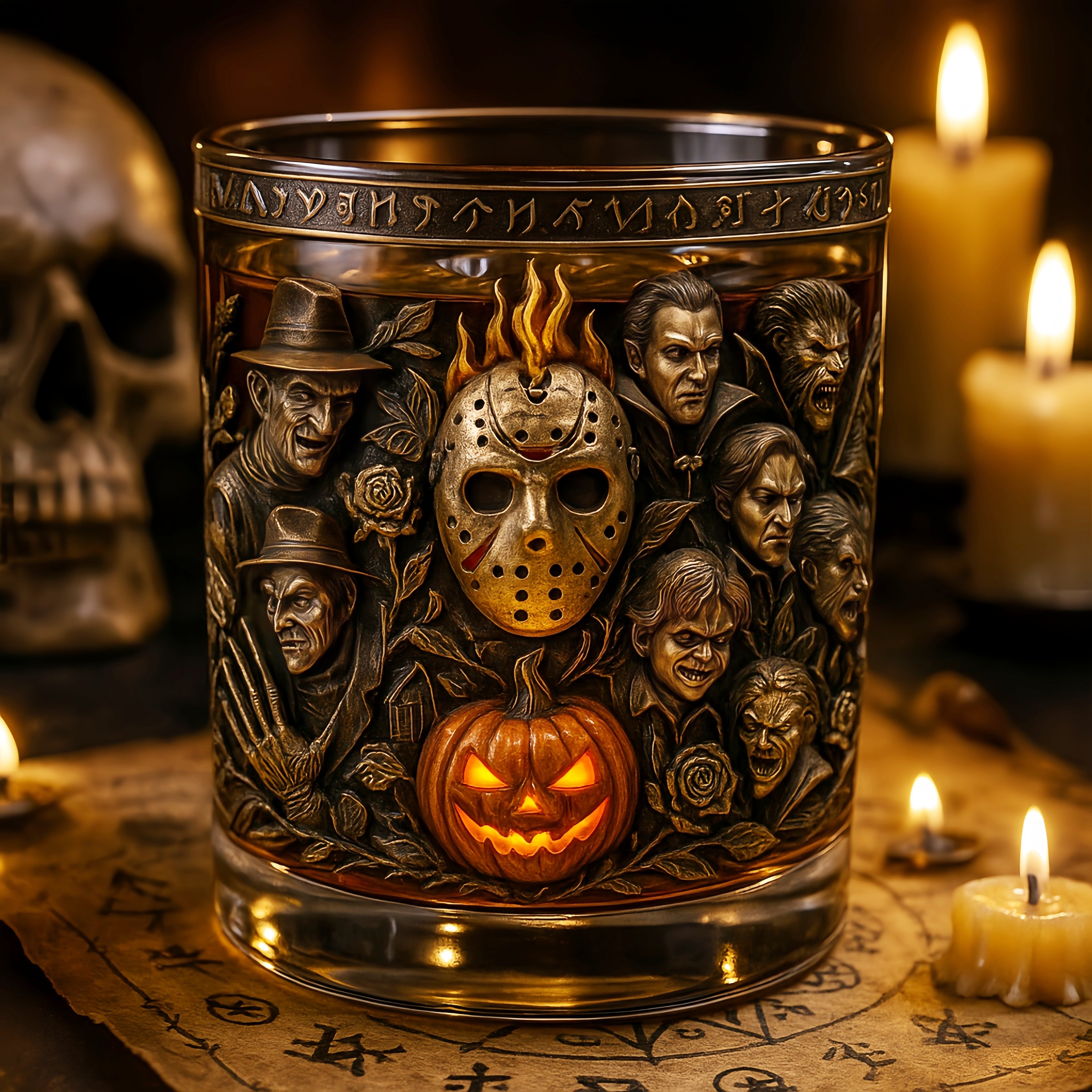 🎃 Step into the ultimate Halloween party — this horror whiskey glass gathers iconic monsters, flaming masks, and a glowing pumpkin to light up the night.